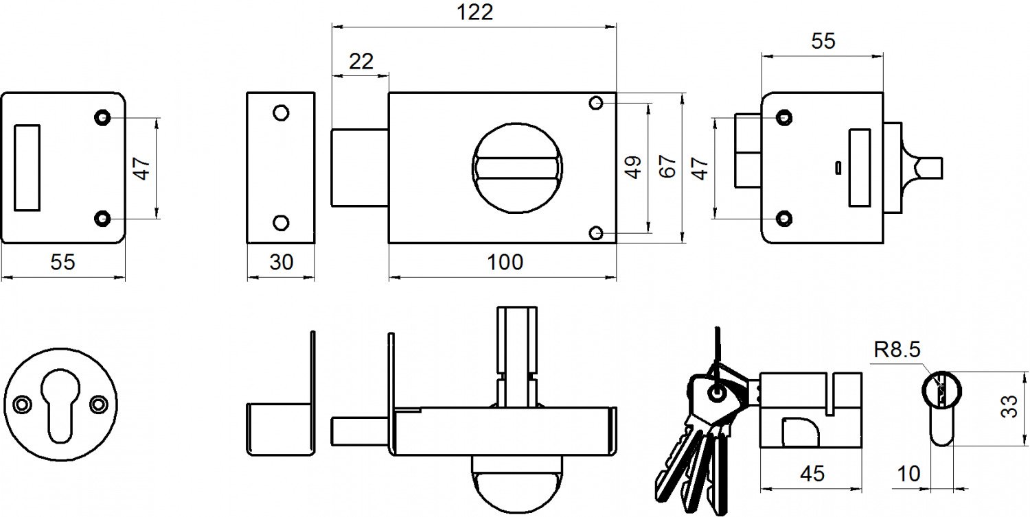 Замок накладной цилиндровый ЗН-1 предназначен для установки в деревянные и стальные двери правого и левого открывания толщиной до 45 мм. Окрашен полимерной краской, цвет: бронза. Ригель стальной прямоугольного сечения. Закрывание и открывание изнутри производится вертушкой, снаружи ключом. Имеется блокировка от открывания ключом снаружи, путем доворота вертушки в крайнее положение при открытом ригеле. Механизм секрета цилиндрический односторонний с английским ключом. Укомплектован 4-мя ключами, запорной коробкой и накладкой.