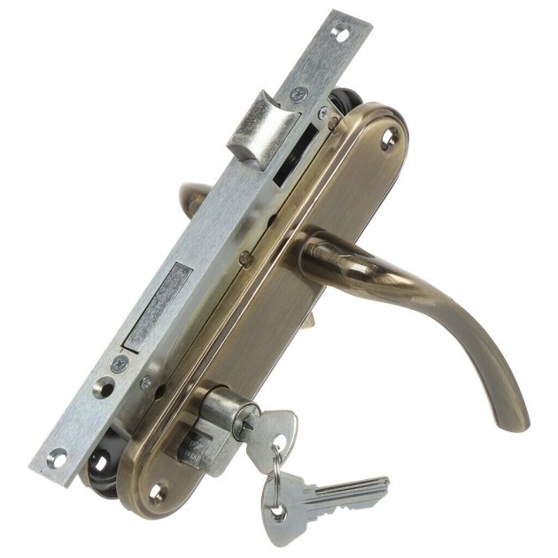 Замок врезной цилиндровый с защёлкой в комплекте с ручкой ЗВ4-70.27 (ант.бронза), 4 кл.
