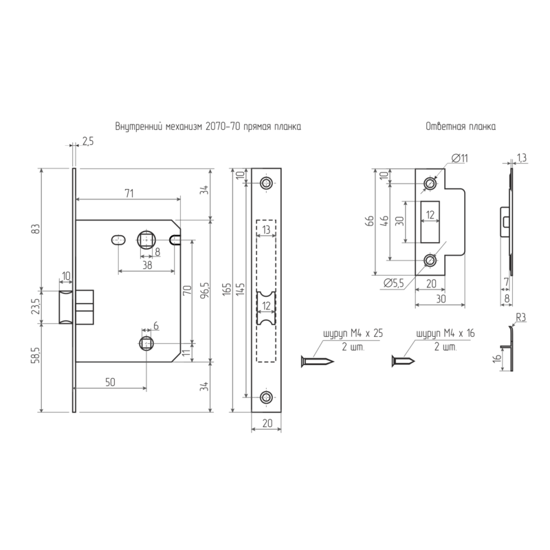 Предназначен для запирания дверей. Выпускается в двух модификациях – с прямоугольной и овальной ответной планкой, в моделях с межосевым расстоянием 47 мм и 70 мм. Данная модель также представлена с бесшумным ригелем.